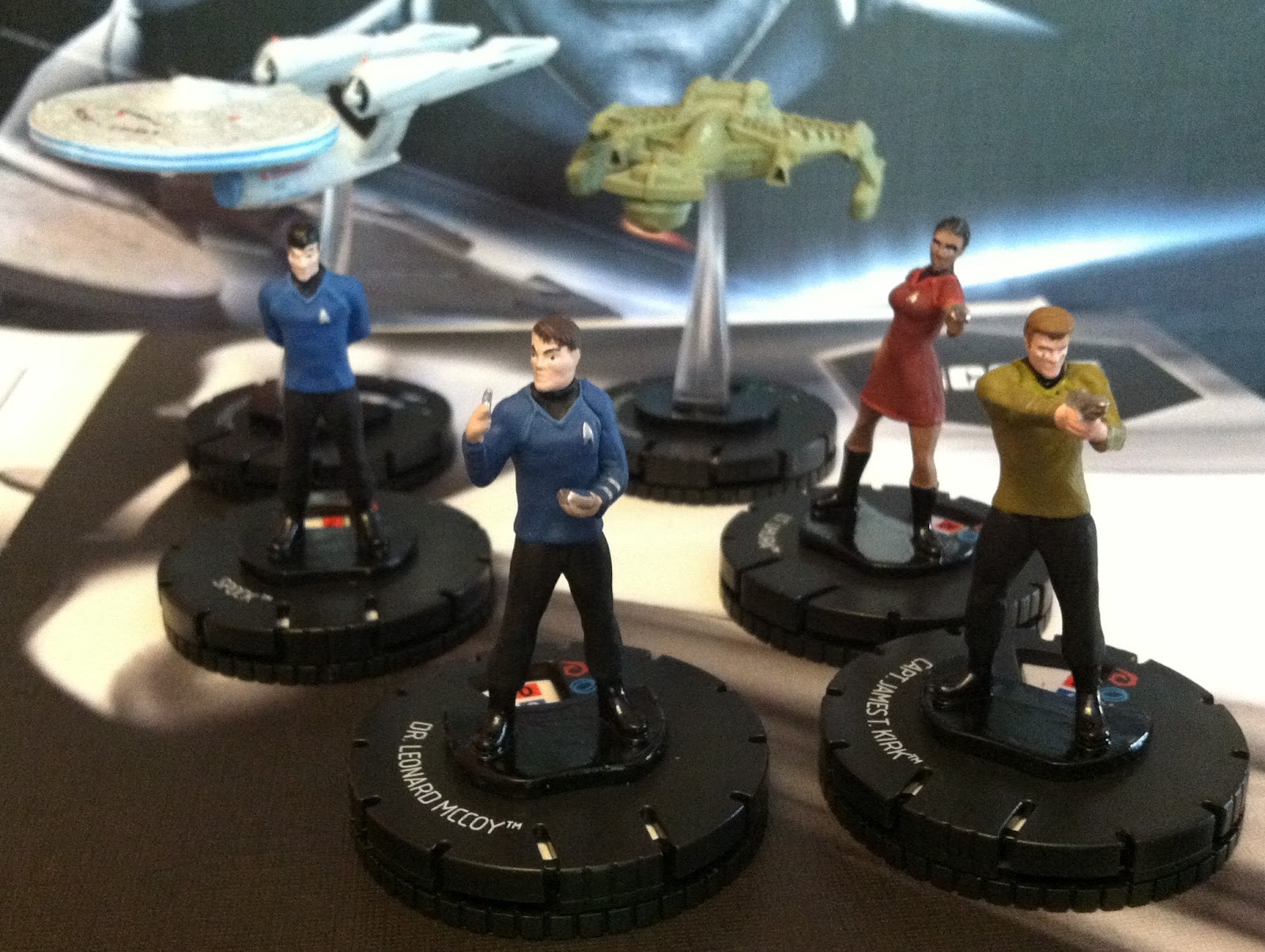 The production value of ST:E is simply astounding for what I paid. I got it off the BGG Marketplace, new, for twenty bucks plus twelve bucks shipping, and I kid you not, it’s worth double. It has six Clix figures, a metric load of cards, a huge board, a little scorecard thing, some wooden bits, and some dice. But everything is just so damned pretty. The cards are awesome. The figures are awesome. The art is, without question, ridiculously, unrepentantly superb. The only faux pas in the whole box is the fact that on some cards there are some important little numbers written in too dark a purple on a black background, and even a youngster like my eleven year old couldn’t read it unless under direct, bright light. But it’s a small price to pay.