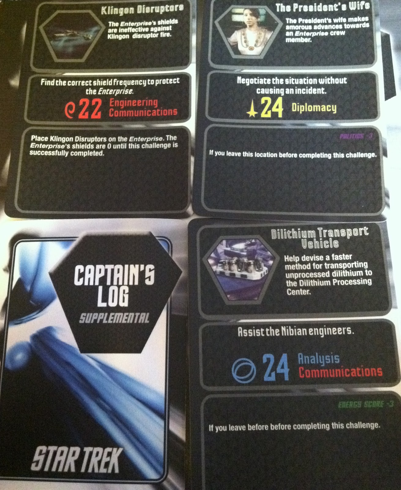 There’s three “levels” to the game, and each one becomes increasingly hard. Now, the skill checks are the same, but on each turn you have to grab a “bad stuff happens” card and resolve it, and so on the easiest level, only one bad event happens, but on the Red Alert level, three bad things happen every turn. To give you an idea of what a difference it makes, our first play on easy resulted on a near-perfect win. Our first play on hard resulted in us essentially losing in every possible category with such an utter level of failure that we really should’ve gone to barber college instead of Starfleet. It’s not like Pandemic where you throw extra Epidemic cards in and all hell breaks loose a little more often. It’s more like every turn is a bitter struggle not to pull the “Francis Rage Fat Guy Table Flip” because the odds are so clearly against you. Yes, it’s that hard.